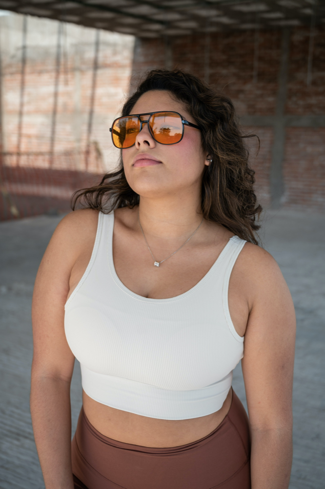 SPORTSBRA CON TELA SUAVE Y COMPRESION MEDIA, TEXTRUA RAYADA, FRENTE Y ESPALDA EN FORMA V. RELLENO REMOVIBLE.